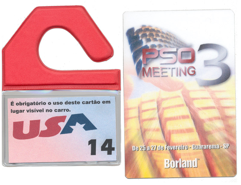 Em PVC flexível, pré-impressos em serigrafia ou off-set, ou em papel cartão para ser usado com o porta-estacionamento ou bolsa plástica como credenciais em eventos.