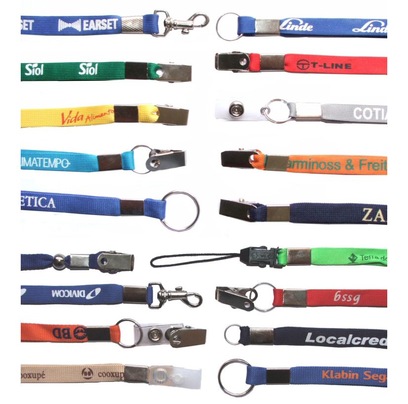 Além dos cordões de nylon e de plástico transparente, os cordões em poliéster podem ser personalizados e ter acabamento em clip tipo jacaré, argola pequena, argola tipo chaveiro, trava de segurança, ou outros.