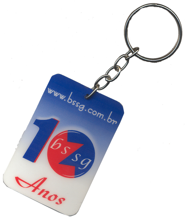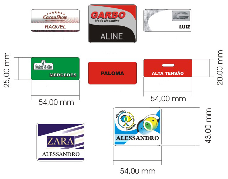 Em PVC flexível, impressos através do sistema de termo-transferência, ou pré-impressos em serigrafia ou off-set, com clip tipo jacaré ou alfinete.